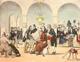 What had been an exotic luxury became available to the masses in the newly invented coffee houses, outlets created specifically to prepare and serve this beverage which was new to most people. Some traditions which live on today were established in those early years: myriad varieties of coffee preparations to choose among, and the freedom to sit for hours on end, reading, talking, just staring into space.