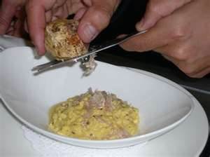White truffles usually come packed in Arborio rice, which will absorb flavors as they await being used. The most economical way to have a white truffle festival is to make your own pasta, splurge on a tiny white truffle and use a vegetable peeler to make paper thin slices, releasing the flavors and smells as you stand over the steaming plate.