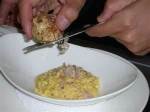 When shaved over a plate of hot risotto (or fettuccine, gnocchi, even roast chicken), the white truffles release an unmistakable and unparalleled aroma. Currently in season, white truffles can be found in some of the best Italian restaurants, shaved sparingly at tableside, often by the owner because they are so expensive, or by the gram weighed before and after they serve you. (Careful!)