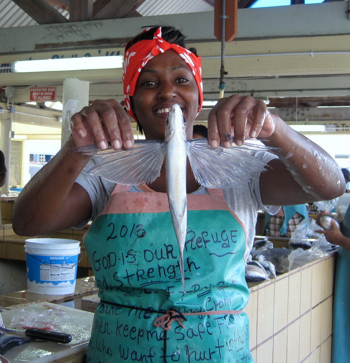 The Barbadan fish markets, at least as exemplified by the one in Bridgetown, the capital, and Oistins (where the Friday night fish fry is a destination in itself) are really fish receivers and processors, accepting the catch on one end, and spitting out processed primal fish cuts (like a gutted swordfish or shark) as well as filets and steaks destined both for the wholesale chain or the homemaker buying for the day’s dinner.