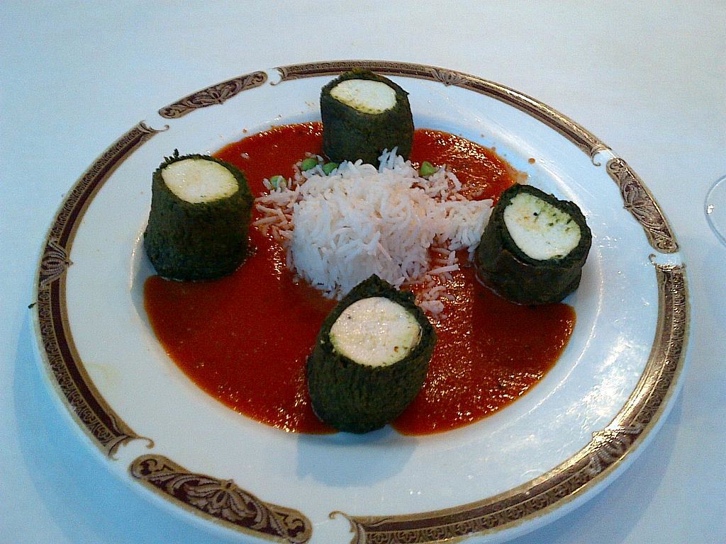 And spinach is ubiquitous in Indian restaurants, known as “saag” on menus, often served sautéed with paneer, a fresh Indian cheese, often home made. A variation on this, called Sham Savera, appeared as the “Chef’s Signature Special” at Coromandel (an Indian restaurant in Stamford, CT): paneer cloaked in seasoned spinach, served with a honeyed tomato sauce and rice, just delicious.